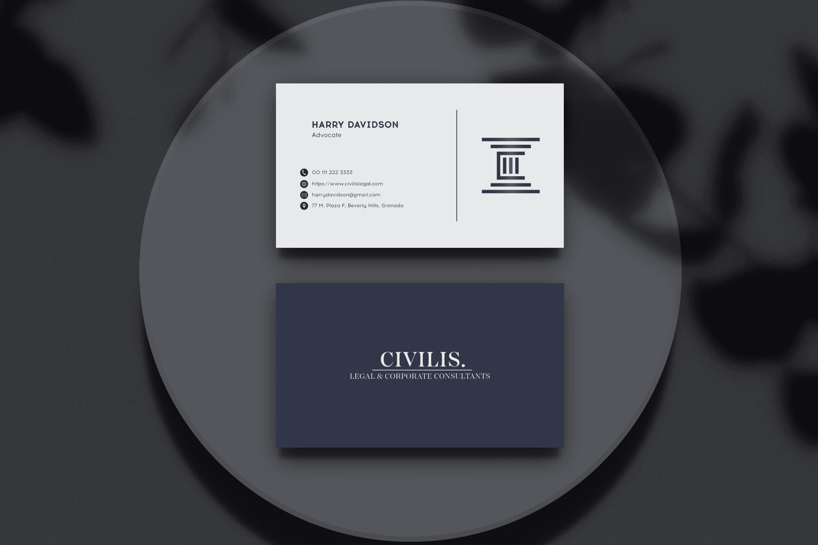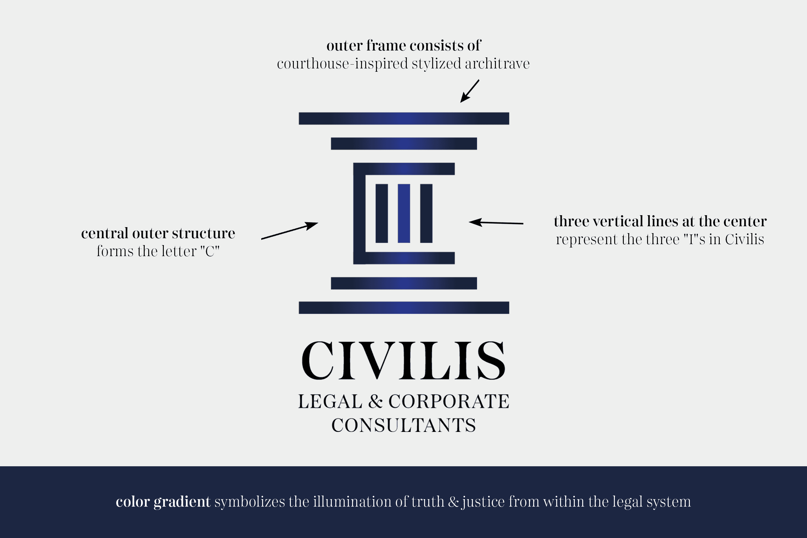 The choice of dark blue and black conveys trust, authority, and professionalism, while the subtle gradient adds depth, signifying the illumination of truth and justice emanating from within the legal system. The design's minimalism underscores clarity and purpose, embodying Civilis' dedication to transparent and effective legal solutions.