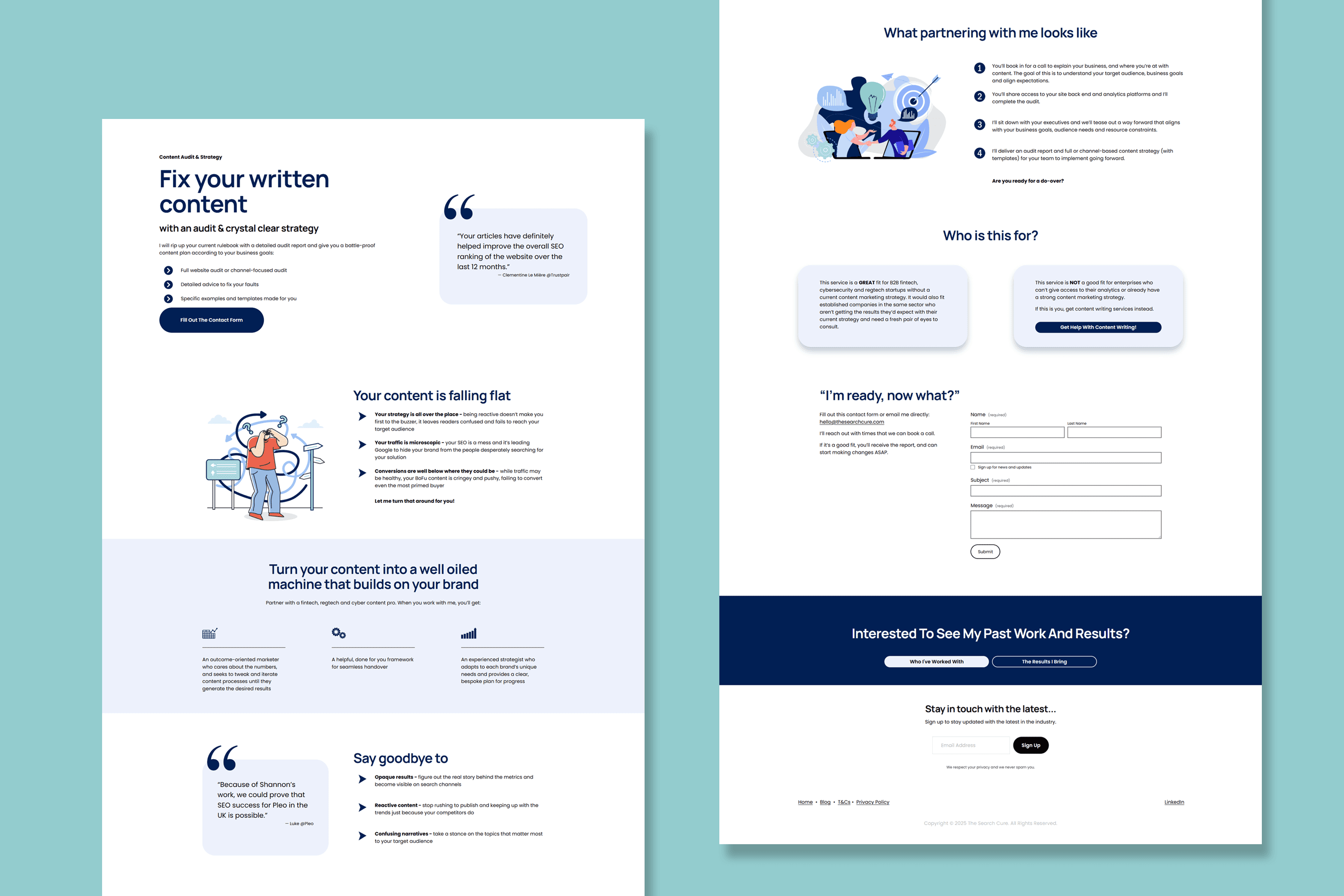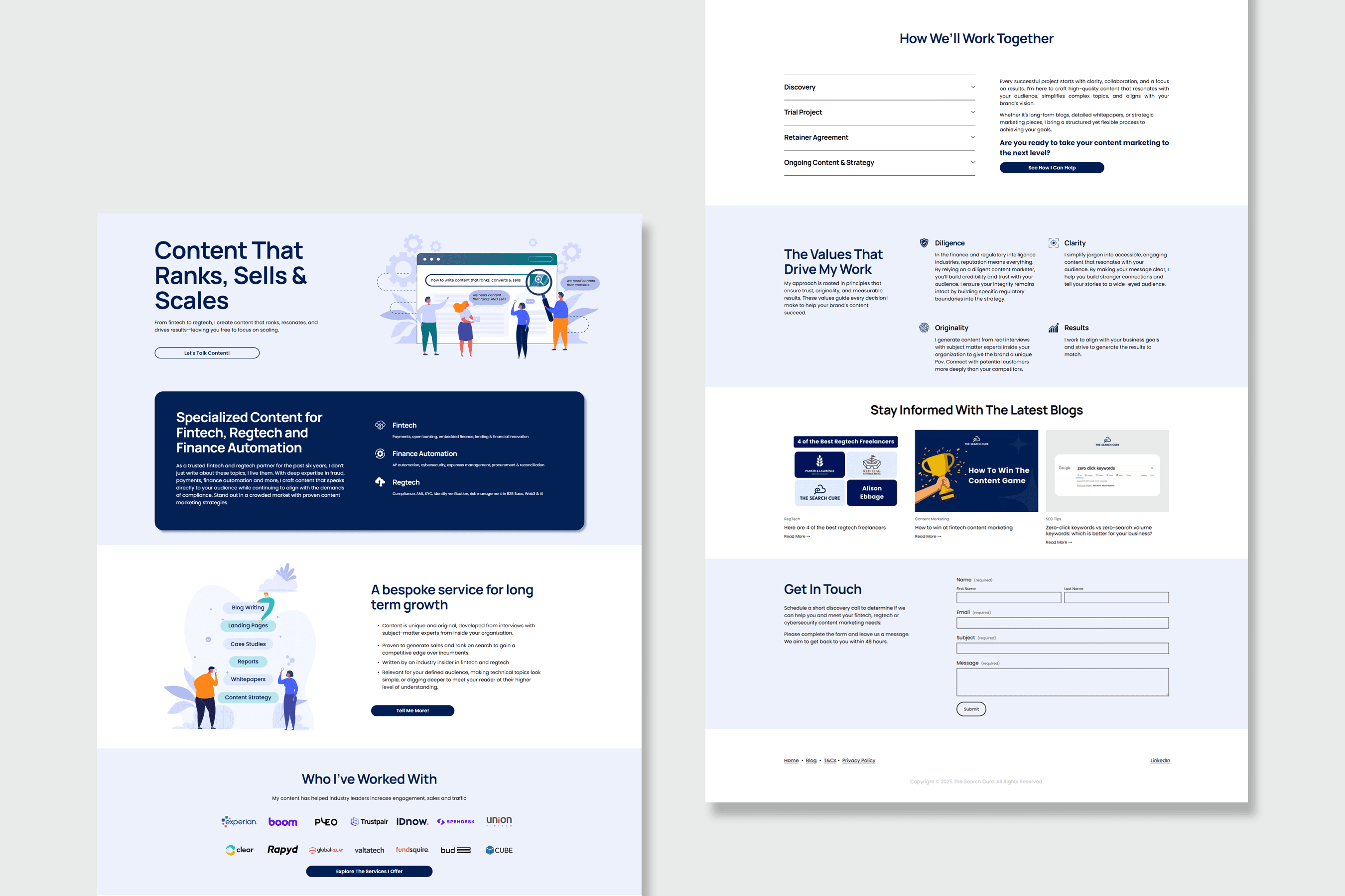 The Search Cure is a personal brand specializing in fintech, regtech, and cybersecurity. Run by Shannon, The Search Cure centres on translating complex, technical subjects into clear, human, story-driven content that builds trust and delivers genuine value. The brand identity highlights what makes Shan distinct in her field: transparency, authenticity, and a hands-on approach grounded in real data. With a focus on clarity and narrative strength, the visuals and tone position The Search Cure as a reliable, strategic partner for companies operating in highly regulated, fast-moving financial and security sectors.